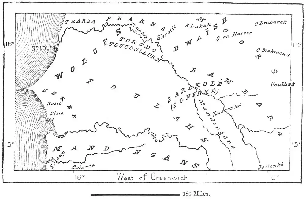 and the Gambia. They are the exclusive inhabitants of the Walo, Cayor, Baol, and Jolof districts, the last mentioned, properly the name of a chief branch, being sometimes applied to the whole nation. Saint-Louis and Dakar, the two centres of French authority, both lie in Wolof territory, and in all the military stations throughout Sudan there is sure to be a Wolof colony preserving its national speech and usages. According to Tautain, the term Wolof would appear to mean "Speakers," as if all other peoples were speechless barbarians; Barth, however, proposes perhaps the less probable sense of "Blacks," in opposition to the neighbouring Fulahs, or "Red" people.