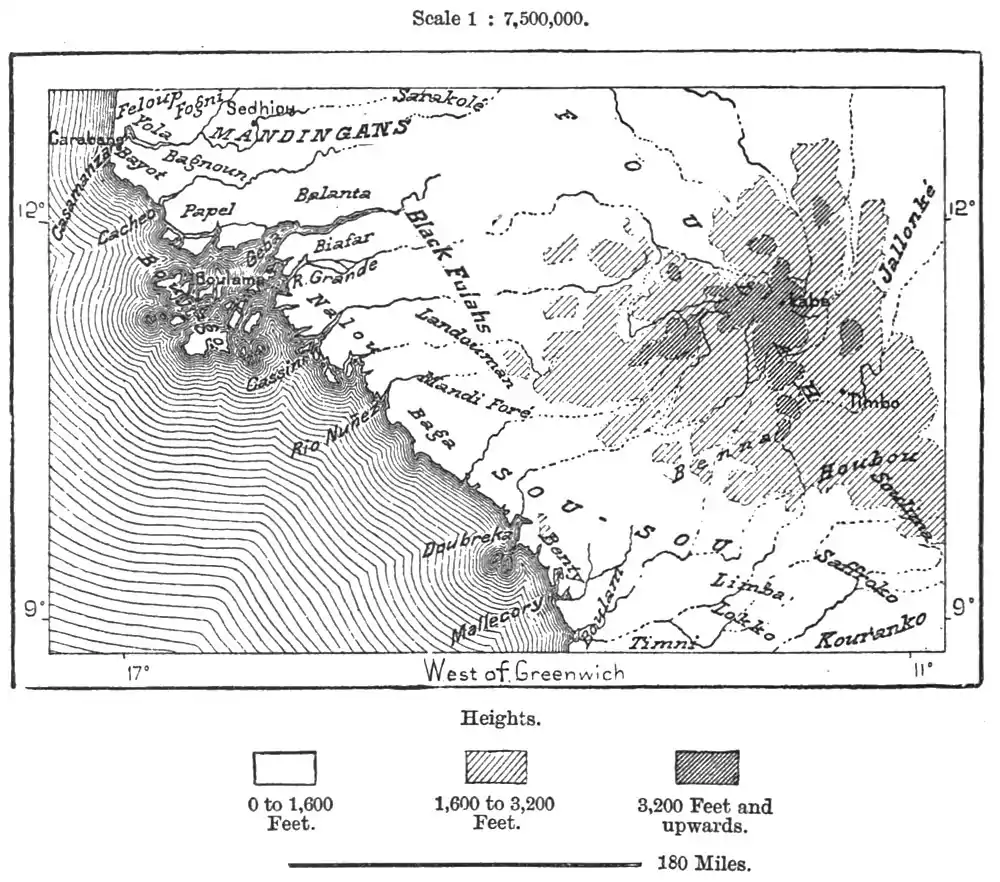 European visitors are struck by the great courtesy shown by the Su-Sus towards each other. At the sight of an aged person bearing a burden, the young man always hastens to relieve him for a part of the way, and strangers casually meeting never fail to inquire after each other’s health and welfare. The speech itself, although monotonous, is soft, very pliant, and easily understood, whence its widespread use as the language of general intercourse among all the native populations of the country. It is a Mandingan dialect, marked by the absence of grammatical gender and the use of prefixes, reduced to writing by the missionaries,