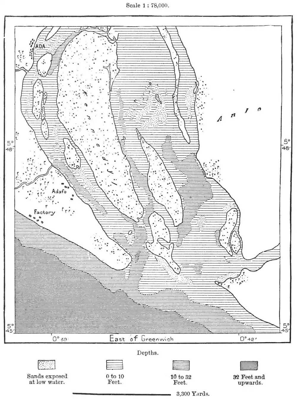 The Afram, which joins the Volta above the gorges, flows through an almost uninhabited region. But on the waterparting between its basin and the sources of the Prah stands the picturesque city of Abetifi, capital of the kingdom chosen