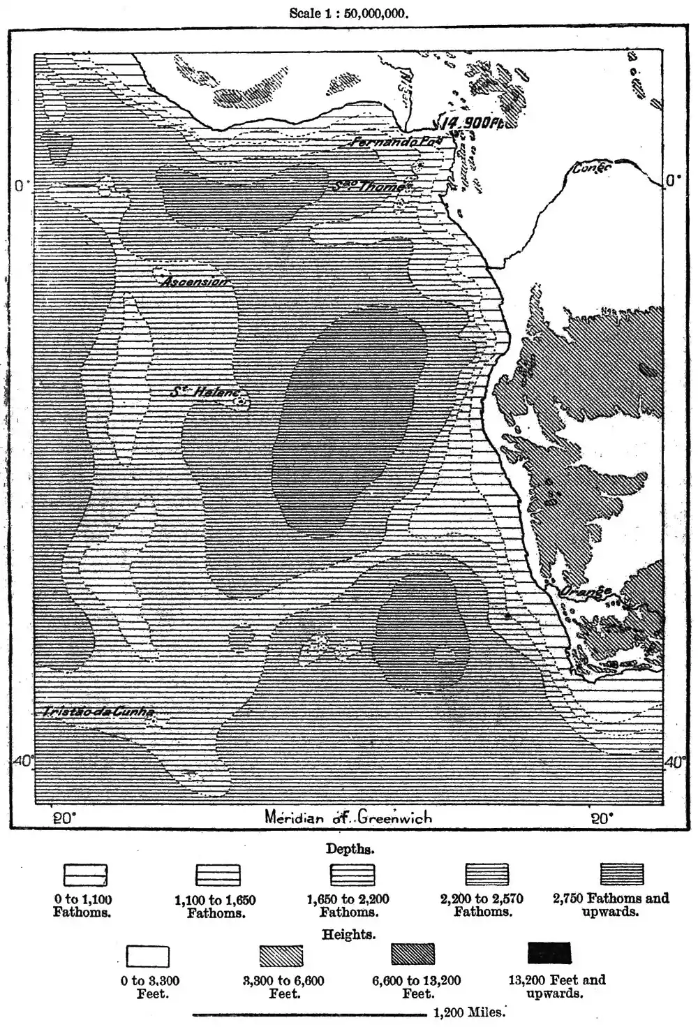 depths of 1,400 and 1,700 fathoms, trend due north and south between the oceanic depression near the African coast and the still more profound abysses on the American side. This parting line, above which rise the peak of Ascension and the