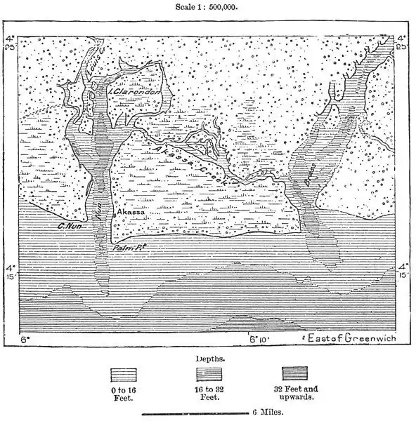 developing a remarkably symmetrical semicircle between the Benin and Brass estuaries, and intersected by countless channels, lagoons, marshes, and stagnant waters, has a coastline of about 210 miles, with a total area of 10,000 square miles.