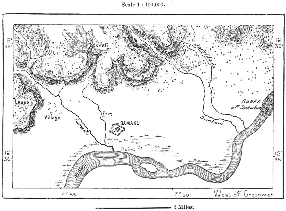 The Mandingan state, also now a French protectorate, has some flourishing places on the left bank of the Joliba and in the interior on the waterparting between the Niger and Senegal basins. Such are Kangaba, on the Joliba, and Sibi on a bluff rising above an extensive alluvial plain to the west. Bamaku (Bamako), formerly a populous trading-place much frequented in the time of Mungo Park, has again