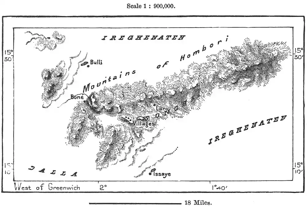 The region stretching north-west of Timbuktu in the direction of the Walata and Tishit oases is peopled by Arabs, or at least a half-caste Berber race of Arab speech. Many Arab traders also penetrate across the river southwards to the Hombori Hills. But east of the meridian of Timbuktu the whole of the Saharian region belongs to the Imohagh (Imosharh) Berbers, whose countless tribes are