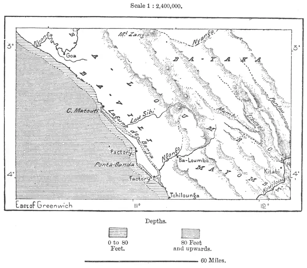 The mixed populations dwelling near the coast, south of the Nyanga river, and collectively known as Ba-Lumbos or Ba-Vilis, consist largely of runaway slaves from the Gaboon and Congo factories, who have taken refuge on this inhospitable seaboard, where they are sheltered from attack by the surf-beaten shore and surrounding swamps and forests. By alliances with the aborigines they have formed fresh ethnical groups, which, however, differ little in their customs from the neighbouring Ba-Yahas in the interior. Like them they suspend