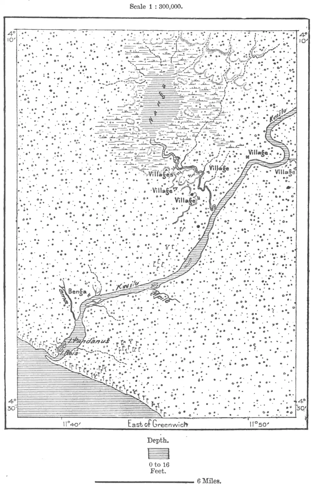 "Little Loango" river, is comprised within the Portuguese enclave, which is limited on one side by the French possessions, on the other by the new Congo State. It is one of the pleasantest places on the whole coast, embowered in the graceful foliage of the palms, above which rise the red sandstone cliffs of the