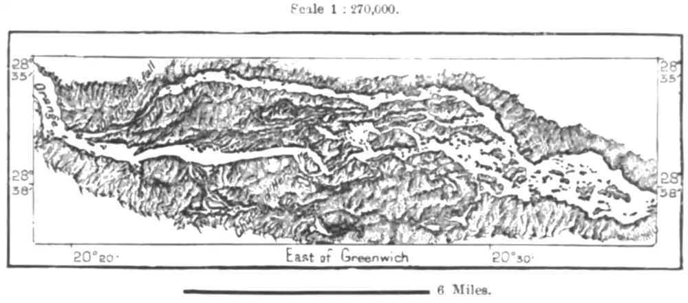 house than from the colour of its waters. The Senku, or chief eastern headstream, is regarded as its true upper course, although exceeded in length by the Vaal. It has its source in an upland valley on the southern slope of the Cathkin, and flows at first in a south-westerly direction between the Maluti and Drakenberg highlands. In this part of its course it rolls down a dark stream, whence its local name of the "Black River." After its junction with the Senkunyané, or Little Senku, it is again swollen by the Malitsunyané, which descends from the western uplands, and which at one point plunges from a vertical height of 600 feet into a tremendous mountain gorge.