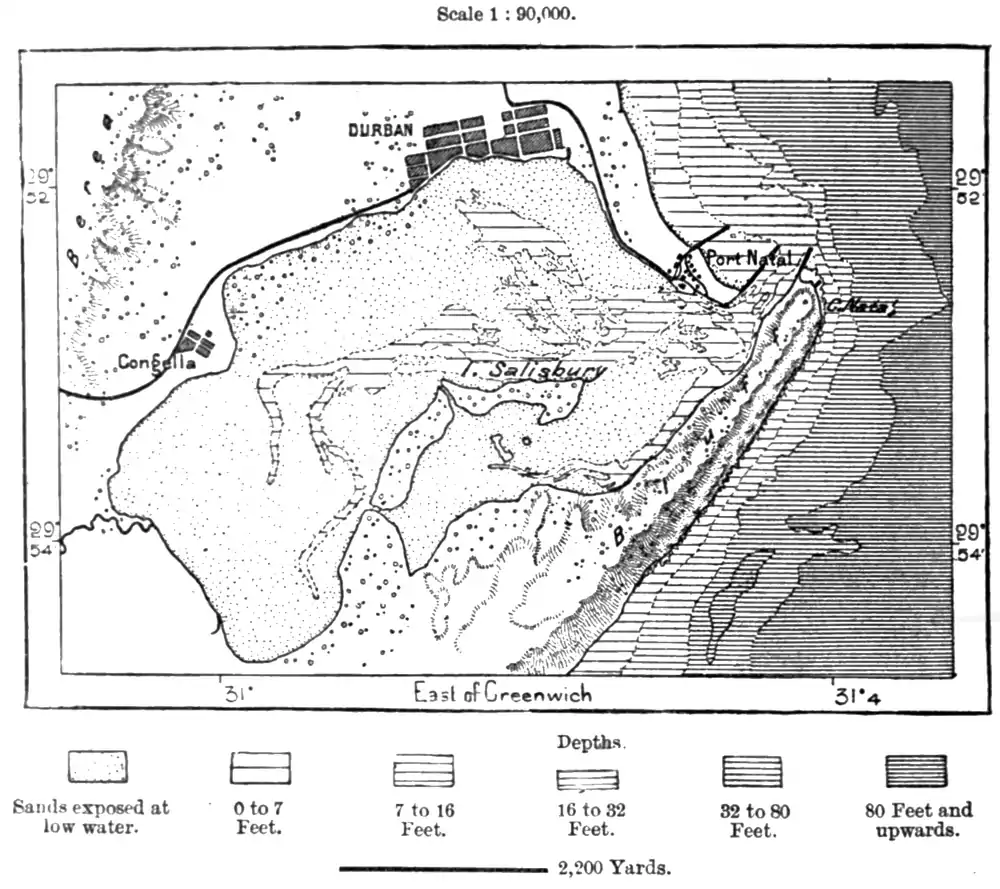 of Marburg. It lies within six miles of the little port of Shepstone, which is formed by the estuary of the Um-Zimkulu, but which is often almost inaccessible to shipping. Other so-called "ports," carefully avoided, however, by skippers, follow northwards along this exposed seaboard, which runs in nearly a straight line from the Kafirland frontier to the capital. Such are Port Harding at the mouth of the Um-Zumbi, and Port Scott in the Um-Pambynioni estuary. But the only pare of the whole coast which is sufficiently indented to offer a large basin to shipping is the inlet of Port Natal, sighted by Vasco de Gama in the yest 1497. At ea point a ridge of rocks with an average height of 200 feet, then, parallel with tho original coastline and afterwards connected by upheaval with the mainland,