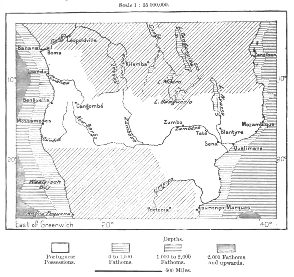 The eastern slope of the continent within the contiguous basins of the Zambese and Ku-Bango begins at a relatively short distance from the Atlantic seaboard. The farthest headstreams of the Ku-Bango, or Okovango, have their