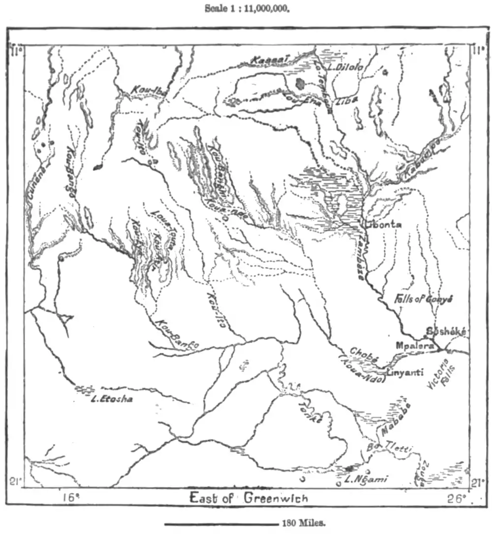 Kwa-Ndo even occasionally effects a junction with this river during exceptional floods, and then sweeps round to the east, here expanding into the serpentine Lake Chobe, which in many places takes the aspect of a river. When Livingstone explored it, the current had a mean depth of from 14 to 16 feet, but would nevertheless be inaccessible to a steamer of any size owing to its extremely sharp windings.