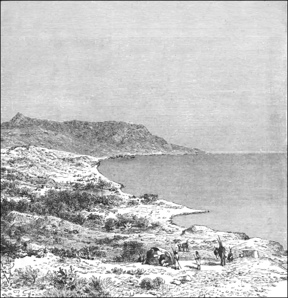 the ravines by which they are broken at irregular intervals give access to shingly steppes where the gravel is in many places covered by a blackish silicious layer, interspersed with ferruginous nodules. These elevated plains reminded the French explorer, M. Révoil, of the appearance of the Crau formations in the south of France. A zone of upheaved coral reefs some miles in breadth, which here skirts the F present shore-line for some distance, seems to indicate a general upheaval of the