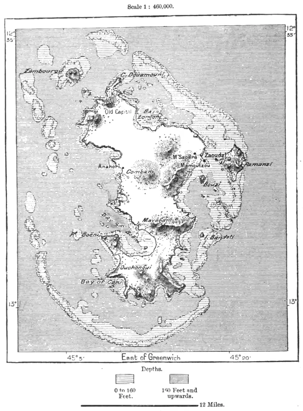 Great Comoro (Ngaziya), although the largest and most populous member of the archipelago, is little cultivated and seldom visited by traders, owing to the absence of water and good havens. The sultan resides at Muroni, a small place situated on a creek on the south west coast.