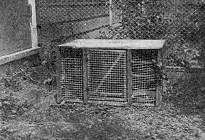 For the 87th test the strings were removed from the right and placed in the niche to the left of the door, place 2, Fig. 19. Oriole 2 was on the door and went thence to where string C used to be. Oriole 1 opened in his usual way by pulling the threads. In changing the outside strings to the left of the door I had, of course, intended to modify the box for Oriole 2. At any rate if we failed to get results on the readiness with which Oriole 2 could do as the female English Sparrow did in series A, we did get some slight indications of imitation of Oriole 2 by Oriole 1. It was very similar to the result obtained a little earlier in this series. In the following test there was likewise a single indication of imitation.