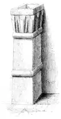 Water stoup, Penmôn commot: one at Penmôn, probably the earliest: the other at Llaniestin: they are both no doubt contemporary with the buildings in which they are placed. The other fonts, which more or less resemble that of Llanvihangel Tyn Sylwy, appear to be of the fourteenth century. At Penmôn until within a few years a water-stoup, of the same date as the font, was used; and at Llandegvan another water-stoup (of the fourteenth century?) is still employed for the baptismal sacrament: in all cases these fonts are placed at the western ends of their respective