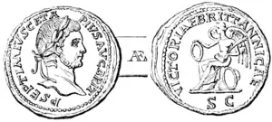 The coins of Severus, and his sons Caracalla and Geta, afford the author ample scope for a dissertation on the events connected with their visit to Britain and their military operations in it. The following coin is one of many varieties relating to this important period in the Romano-British history. It is of Geta, and in second brass: the reverse presents a Victory seated on shields, holding a palm-branch, and a shield resting on her knee; legend, victoriae brittannicae. It will be observed there is a change in the orthography of the word Britannia: for this alteration Mr. Akerman gives some pertinent reasons.
