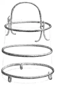 Fig. 3. This bucket (represented in fig. 3) appeared to have been about a foot high; the lower hoop was a foot in diameter, and the upper hoop exactly ten inches. A somewhat similar bucket is represented in one of the plates of Douglas's Nenia. The hooked feet appear to have been intended to support the wood, and prevent its slipping in the bucket. From the similar hook found in the grave No. 1, and the fragments of hoops in the smaller grave, I am inclined to think that similar buckets were originally placed in both. A little higher up in the grave, in the position generally occupied by the right leg of the person buried, was found a considerable heap of fragments of iron, among which were a boss of a shield of the usual Saxon form (fig. 4), a horse's bit (fig. 5), (which appears to be an article of very unusual occurrence), a buckle (fig. 7) and other things which appear to have belonged to the shield, a number of nails with large ornamental heads, with smaller nails, the latter mostly of brass.