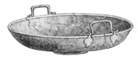 Fig. 8. (fig. 8), about a foot in diameter, and two inches and a half deep, of very thin copper, which had been thickly gilt, and with handles of iron. It had been placed on its edge leaning against the wall of the grave, and was much broken by the weight of the super-incumbent earth. The only other articles found in this grave were two small round discs resembling counters, about seven-eighths of an inch in diameter, flat on one side, and convex on the other, the use of which it is impossible to conjecture, unless they were employed in some game. One was made of bone, the other had been cut out of a piece of Samian ware. The most singular circumstance connected with this grave was, that there were not the slightest traces of any body having been deposited in it; in fact, the appearances were decisive to the contrary; the only ways in which we could explain this were either that the body had been burnt, and the ashes deposited in an urn concealed somewhere in the circuit of the grave (which is not probable), or that the person to whom the grave was dedicated had been a chief killed in battle in some distant expedition, and that his friends had not been able to obtain his body. This view