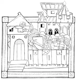 In another part of our romances we learn how Sir Iwain loses his way similarly in a wood, and how he finds a path which leads him to the castle of a poor gentleman on the border of the forest. He hastens thither because he hears a horn sounding for assistance. He finds the breteske open, and a young man (vallet) in the upper part who is sounding the horn. It appears that this castle is occupied by the young man, his mother and sister, and a small number of serjeants or household servants, and that a party of robbers from the forest have succeeded in surprising it, and are occupied in killing his mother and the servants, and in outraging his sister, he alone having taken refuge in