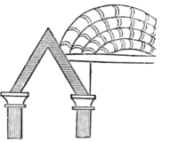 Fig. 13. represents another of these triangular-arched door-ways from the Cottonian manuscript. It is accompanied with what is intended to represent a dome. Domes occur frequently in the manuscript, and form a connecting link between Anglo-Saxon and Byzantine architecture. The dome represented in our cut appears to be covered in a very singular manner with parallel semicircles, apparently of tiles; the form which occurs more generally in the manuscript has a knob or ball at the summit, from which, as a centre, the rows of tiles radiate. It may be observed also, that in these drawings the roofs are generally covered with tiles which, in form and arrangement, bear a close resemblance to the scales of a fish.