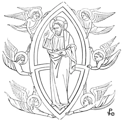 be assured that the subject is ably treated. After an introduction of some length on the object and practice of pictorial representations of religious history and doctrine, M. Didron enters upon his subject by treating first one of the most striking characteristics of divinity and sanctity, which, when it appears about the head is called the nimbus, and when it encircles the whole body he distinguishes by the term aureole or glory. The nimbus is used very extensively; but the aureole surrounding the whole body is almost entirely restricted to the Divine Persons and to the Virgin, and does not dispense with the use of the other at the same time. The following figure, (fig. 1,) taken from an illuminated Italian MS. of the fourteenth century, in the Bibliothèque Royale at Paris, represents Christ carried up to heaven by angels: the Saviour has the nimbus about his head, and an elliptical glory about his whole body; the angels are also nimbed, but with a nimbus of an inferior rank.