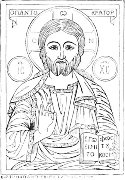 the Father, and is frequently represented in the act of creating, as well as in other acts and attributes belonging to the Father. In the following figure (fig. 10.), from a fresco of the eighteenth century, at Salamina, Christ is represented as the Almighty—ὁ παντοκράτωρ. In some instances we find the second Person of the Trinity placed in a superior position, or with higher attributes, than the first. In other instances we find the Father clothed in the attributes of pagan deities, as the god of combats, &c. Some of the singularities of this kind may perhaps be attributed to sectarian doctrines which ruled at the time and place where they were made. Platonism, Judaism, and Gnosticism, are sometimes traced distinctly in early monuments. The Father is frequently represented by a mere hand, inclosed in a nimbus, and issuing from the clouds: he generally appears aged and with a beard, and is frequently clad in the mantle and crown of a Pope.