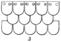 The fashion of other examples of helmets is most eccentric, and the chasings in high relief, with which they are mostly enriched, are of admirable workmanship; these helmets formed with cheek-pieces (bucculæ), the projectura in front, and the cudo, or defence for the neck behind, were worn by the Roman officers. It is interesting to the English antiquary to compare these curious types with the bronze head-piece discovered at Tring in Hertfordshire, of much more simple fashion, and unfortunately in imperfect condition[1]. No other specimen, as we believe, has been found in this country. There are many objects of other classes which claim attention as illustrative of relics of the Roman age disinterred in England. Such, for example, is the example of scale-armour (see woodcut), which recalls the curious fragment of bronze found at Cataractonium by Sir . Lawson, and figured in this Journal (volume viii., p. 296). The armour here represented is of bone with ligatures of bronze. Many forms of the 3 fictile and other vases are such as are already familiar to us amongst the vestiges of Roman occupation in our own country; one of the glass drinking vessels, with singular ornaments like drops on its surface, may be noticed on account of the resemblance in form to some discovered with Anglo-Saxon remains in England. (Plate xxx., fig. 6.)