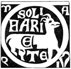 Mr. Way exhibited a singular pavement-tile, which was found amongst the ruins of Ulverscroft Priory, in Charnwood Forest, near Mount-Sorrel, Leicestershire. Mr. Henry Stanley, who communicated this example of the Decorated tiles fabricated in the fourteenth century, states, that an accumulation of soil, to the depth of from three to five feet, now covers the floor of the ancient church: the principal remains consist of the tower, and the southern wall, with three beautifully sculptured sedilia, and three large windows. The tile seems to have formed a part of a set of signs of the zodiac, and presents a figure of the ram, with the inscription sol in ariete, and in the angles appear traces of letters, apparently m. a. r. . . which may relate to the month of March, in which the sun enters into that sign. The zodiac, and emblematical representations of the months of the year by the ordinary occupation of each successive season, were frequently introduced in sculpture, painting, and other decorations. The curious pavement in Canterbury cathedral, composed of a kind of coarse mosaic work, affords a remarkable example: the ram is one of the figures still to be seen there. A curious set of decorative tiles, representing the months, and signs of the zodiac, existed in the chancel of Bredon church, Worcestershire.