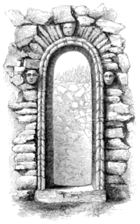The altar, benches and walls within the church, were plastered with a white substance now commonly known as china clay, and the floor is composed of the same material mixed with coarse sand. From the two doorways it will be observed that three steps lead down into the church; it seems to have been a feature of British structures to have the floor lower than the ground outside the walls, a peculiarity which is also found in the domestic buildings of early times which have been discovered. Of the doorway itself, destroyed soon after the first discovery, some notion maybe formed from the representation here given, copied from a sketch which was taken at that time. The carved heads and a portion of the moulding are preserved in the museum at Truro; it may deserve notice that their position presents a feature of analogy between this building and the ancient chapel at Clonmacnoise, near Seir Kyeran in King's County, supposed to have been founded by St. Piran, the doorway of which was ornamented in a similar manner. The rude character of the masonry is shewn in the accompanying wood-cut,