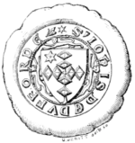 The annexed cut represents an impression from the brass matrix of a personal seal of the fourteenth century, discovered in a field at Newnham Murren, near Wallingford. It is now in the possession of Mr. J. G. Payne, of Wallingford, who forwarded it for the inspection of the Committee. From the legend—*s' ioh'is . de . dvfforde.—and the armorial bearings on the shield, it seems probable that it may have been the seal of John de Ufford, who was summoned to Parliament in 34 Edward III., A.D. 1360. He was the son and heir of Ralph de Ufford, brother of Robert, first earl of Suffolk. In 27 Edward III. he had a grant in fee of the manor of Great Belstead, co. Suffolk, parcel of the possessions of the alien abbey of Aumale[2]. In 33 Edward III. he was appointed one of the Commissioners of Array for the county of Norfolk[3]. He died in 1361, holding at the period of his decease the manor of Great Belstead, and lands at Burgh, Glemham, and Chipenhale, co. Suffolk, and at West Lexham and Postwick, co. Norfolk[4]. Mr. Davy, of Ufford, who has obligingly supplied several instances of the name having been written 'de Dufford,' selected from the Leiger Book of Blythburgh Priory, observes that the Uffords derived their arms, sa. a cross engrailed or., in the first quarter a mullet ar., from the family of Peyton, settled at Ufford, Glover in his ordinary assigning this coat to Peyton. On the other hand it is stated in Bloomfield's history of Norfolk, that the Uffords bore this device by permission of the family of Hovel. The presence of the lions on this seal can only be explained by assuming them to have been introduced as ornamental details; it does not appear that the Uffords ever used a lion as a crest or cognizance. Mr. Payne also forwarded for inspection another brass matrix, found at Clapcot, near Wallingford: the device appeared to be a badger under a bush or tree; the legend reads *s' ioh'is . de . gildeford., date about the end