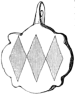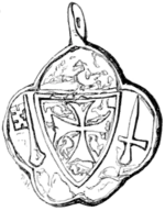 Amongst numerous specimens of the work of the Limoges enamellers, communicated to the Institute, the small armorial scutcheons, some of which are here represented, appear not undeserving of notice. Two discovered among the remains of Newark Priory, Surrey, were brought by Dr. Bromet; one charged with the cross flory between five martlets, the bearing attributed to Edward the Confessor, and assumed by Richard II. in conjunction with the arms of England; the other argent, three fusils in fess gules, the bearing of Moutacute. Mr. John G. Nichols exhibited several of these scutcheons, formerly in the collection of the Dean of St. Patrick's, on one of which was a lion passant on a field azure, within a tressure flory; on another a fleur-de-lis; on another appeared a dragon on the obverse, the reverse being paly, dimidiating a bearing semé of fleurs-de-lis. Another curious example is in the possession of the Rev. Walter Sneyd; two are in the collection of Mons. Sauvageot, at Paris, one of which, bearing the arms of France with a label of three points, each charged with three castles, is remarkable as being furnished with a loop, or attachment, at the side. Enamelled scutcheons of this fashion and dimensions are appended to the consecrated rose, presented to the Count of Neufchâtel by the Pope, in the thirteenth century, now in the possession of Col. Theubet. These ornaments appear, however, to have been appended to the trappings or harness of horses, and one specimen belonging to Mr. Nichols has preserved the adjustment by which it had been attached to the leather. In a MS. preserved in Trinity College, Cambridge, there is a drawing which represents a charger thus caparisoned; the peytrell, or breast-band, has a row of these scutcheons appended to it all around the horse's breast[1].