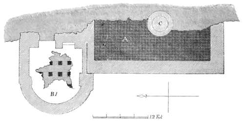 disencumbered of buildings, about 60 ft. back from the line of Thames Street, and nearly 14 ft. below the level of the pavement. Such parts, as from their materials and construction may be undoubtedly called Roman, present two distinct features; the first in order, as being nearest to the street, is a pavement or floor of coarse red mosaic, (A in plan,) 23 ft. from north to south, and laid bare in one part to the extent