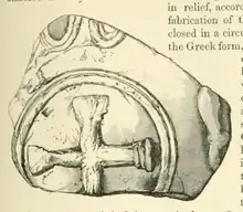 "Samian" ware of fine quality, especially interesting as bearing the Christian symbol of the Cross. Of this curious relic, exhibited at this meeting, we are enabled here by his kindness to offer a representation. The ornament is in relief, according to the usual mode of fabrication of this ware; the Cross is en- closed in a circular compartment; it is of the Greek form, with limbs of equal length, each terminating with a kind of gradated ornament, which recalls to mind crosses of the Anglo-Saxon age. (Compare, with respect to this feature, the Cross upon which Canute lays his hand, in the drawing copied by Strutt from the Register of Hyde Abbey).[1] It does not appear that any other example of a Christian symbol had been noticed on "Samian" ware: Mr. Thomas Kent, of Padstow, Cornwall, discovered some years since in the sands near that place, on a site which he considers to have been occupied by a Roman town or village, some curious fragments of fictile ware, marked with Crosses impressed. Roman coins, fibulæ, and other remains were found at the spot. Mr. Kent very kindly sent some of these fragments for comparison with the specimen found at Catterick: they are of a dull red ware, not "Samian," but certainly, as he believes, of the same period. By long exposure to the weather the surface has become decayed, and it is difficult to form any decided conclusion in regard to the ornaments in question, or their claim to be regarded as Christian devices.