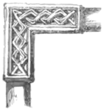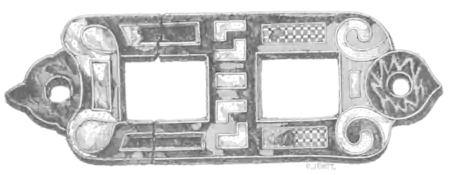 An ornament of mixed metal, here represented, from a beautiful drawing by Mr. Digby Wyatt. It is very curiously inlaid with enamel of red and brownish yellow colours. It exhibits, also, specimens of a remarkable glass-mosaic, in chequered work of blue and white, incrusted in cavities chiselled out on the face of the metal. This kind of ornament is formed occasionally on ancient Irish works in metal; it bears much resemblance to some antique ornaments discovered with Roman remains; it occurs on the curious bronze basin found in the bed of the River Witham, near Lincoln, and exhibited in the Museum formed during the meeting of the Institute in that city. That remarkable object is now in the possession of Mr. Hawkins, of Bignor Park, Sussex.