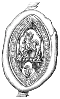 A few coins and counters were found at depths varying from six to ten feet. Some of these are very much worn and not to be deciphered. Two of them, however, are Nuremberg counters, of the sixteenth or seventeenth century; one of which bears the name of Hans Schultz. One of the coins is that of a Ferdinand; and there is a second brass Roman coin, perhaps of Trajan. The most interesting object found at the same level is, however, the brass seal of the keeper of a chapel dedicated to the blessed Mary at Morton Folliot. This seal is probably of the fourteenth or fifteenth century, and bears the inscription, "S.' Cõmune C'todi Capelle bẽ Marie de Mort' Folliot." It has for a device, a figure of the Virgin and Child, and beneath, that of an ecclesiastic with the hands uplifted in the attitude of prayer. It is difficult to understand how this seal can have made its way from Morton Folliot in Worcestershire to Lamel-hill.[3]