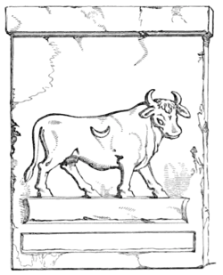 There is, however, considerable reason for supposing the Cornish relic of the Roman period. Champollion, in his catalogue of the Museum of Charles X. in the Louvre, calls some of the porcelain figures, those of the bull, Onuphis, the symbolical image of Amen Generator. He also mentions two figures of calcareous stone, brought from the tomb of Sethos I., and figures of the bull, Mnevis, in bronze and porcelain.[2] In his description of the figures of Apis in the same collection, he mentions a figure of Apis having a crescent on the flank. On two cippi of the Roman period, in the British Museum, certainly not older than the age of Hadrian, and ornamented with bas-reliefs, relative to Egyptian rites, are two bulls,[3]—-