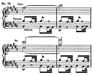 which, however, after a short existence of four bars, is dissolved into an astounding passage of semiquavers for all the Strings (except the Basses) in unison and sempre pianissimo, leading into an episode entirely different and distinct from anything that has come before it, and of the most beautiful effect:—