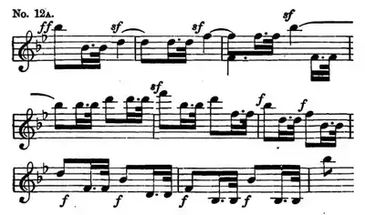 The G-flat and G-natural with which the members of the passage alternately commence seem to be entirely accidental to the chords which follow them; and perhaps it is this fact that is the secret of the peculiar tender, poignant effect that they produce. The passages repose on the figure quoted in No. 9, here given in the Drum; and it will be observed that here again the phrases are hurried, as the conclusion is approached.