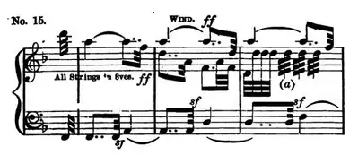 of the several parts. For this, he prepares by a repetition of the prologue (No. 1). But in how different a style from that in which it first crept on our notice! Instead of that vagueness and mystery which made it so captivating, it is now given with the fullest force of the Orchestra and the loudest clamor of the Drum and in the most unmistakable D major. Its purpose is accomplished, its mission fulfilled, its triumph assured. No need now for concealment or hesitation. And so it merges into the great descent of the main subject,—in D minor, it is true, but not a mere unison as before,—in full harmony, with a Bass ascending in contrary motion, and all possible noise. Nor is this all. To give greater weight to the main features of the subject, it is lengthened out by the insertion of two bars in the middle and two bars at the end. See (a) (a) and (b) (b):—