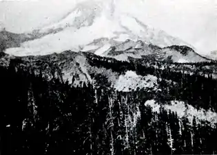 CLOUD CAP INN, the loghouse hotel fastened down with cables high on the north side of Mount Hood, is too near timber-line to claim a great variety of feathered guests, but Oregon Jays and Clark′s Crows or Nutcrackers are regular pensioners of the house. The usual shooting by tourists does not menace them, for the nature-loving mountaineers, who keep the Inn and act as guides to the summit, guard most loyally both birds and beasts. They like to tell of a noble Eagle which used to fly up the canon and circle over the glacier every day, and they recall with pleasure the snowy morning when an old Blue Grouse brought her brood to the Inn, and the birds ate the wheat that was thrown them with the confidence of chickens. The Grouse were, apparently, regular neighbors of the Inn, and while there I had the pleasure of seeing a grown family. They fed on the slope close above me with the unconcern of domestic fowls, conversing in turkey-like monosyllables as they moved about, and two of them came within a few feet and looked up at me—that not forty rods from the Inn! The pleasure of the sight was doubled by the reflection that such things could be so near a hotel, even on a remote mountain.