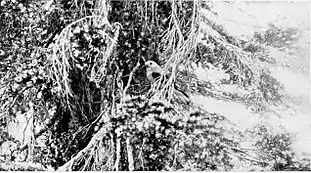 The Jays talked a good deal in going back and forth, and their notes were pleasantly varied. One call was remarkably like the chirp of a Robin. Another of the commonest was a weak and rather complaining cry, repeated several times; and a sharply contrasting one was a pure, clear whistle of one note followed by a three-syllabled call, something like ka-we-ah. The regular rallying cry was still different, a loud and striking two-syllabled ka-wheé. The notes of Clark′s Crow often suggested the rattling of the Red-headed Wood-pecker. The bird had a variety of kerring, throaty notes, and when disturbed, as at the unexpected sight of me at its dining-room, gave a loud, warning quarr. Besides these Woodpecker-like calls, it had a squawking cry similar to that of Steller’s Jay.