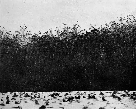 Photographed by moonlight near Salem, N. J., December 20, 1901, by C. D. Kellogg. Plate exposed from 4 A. M. to 5 A. M. The birds in the foreground had fallen from their roosts during the night. (See fronispiece and also article on this Crow roost, by Witmer Stone, in Bird-Lore for December, 1899.)