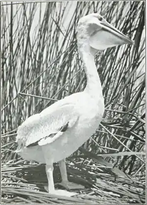 It takes about a month for the pelican to hatch its eggs, and the baby pelican is naked, helpless and ugly, and has to be shielded from the sun by its mother. Its ugliness increases with age till the youngster is covered with white down. The young birds stick close to the nesting site where they are fed by the parents, until, when about six weeks old, they begin to run about and mingle with the other young birds.