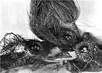 On June 15, 1898, I found a nest with young almost ready to fly. The nest was placed in a sugar pine near the extremity of a limb and about thirty feet from the ground; elevation about 9000 feet. The female was on the nest and as soon as I climbed the tree she uttered a note of distress which soon brought the male to the scene, where he joined her complaint. The notes of the male and the female are very much alike. Another nest found June 18, 1898, was placed near the extremity of a long slender limb in a yellow pine about fifty feet up. I watched the bird for fully half an hour before finding the nest and it was only with great difficulty and risk that I secured the set of three slightly incubated eggs. The nest was surrounded by pine needles and it could not be seen even from the tree in which it was situated until I was within three or four feet of it. The bird sat very close and did not leave the nest until I had cut off the limb on which it was placed and then she hopped about within four or five feet of me. The male was also near by and both birds kept up the usual note of alarm. The nest is a beauty, being covered with a wide brown material supposed to be bits of fur blossoms and is lined with fine rootlets.