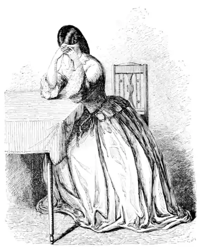 ‘The young lady had sunk upon a chair, and was burying her face in her trembling hands, while hot tears coursed down her burning cheeks.’–Page 125.