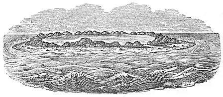 de Laval well exclaimed, "C'est une meruille de voir chacun de ces atollons, enuironné d'un grand banc de pierre tout autour, n'y ayant point d'artifice humain." The accompanying sketch of Whitsunday Island in the Pacific, copied from Capt. Beechey's, admirable Voyage, gives but a faint idea of the singular aspect of an atoll: it is one of the smallest size, and has its narrow islets united together in a ring. The immensity of the ocean,