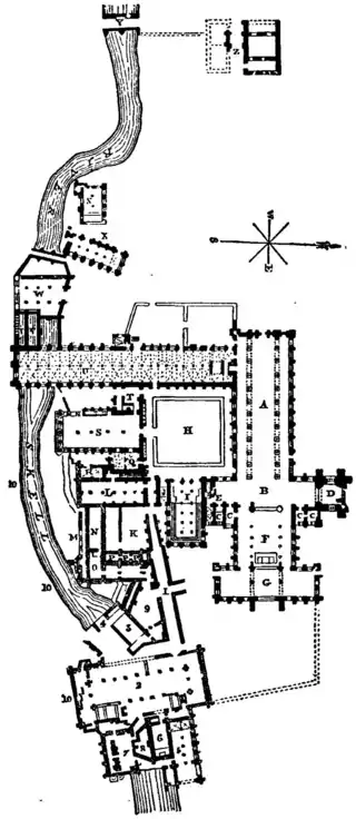 buildings of the abbey stretching down to and even across the stream. We have the cloister (H) to the south, with the three-aisled chapter-house (I) and calefactory (L) opening from its eastern walk, and the refectory (S), with the kitchen (Q) and buttery (T) attached, at right angles to its southern walk.