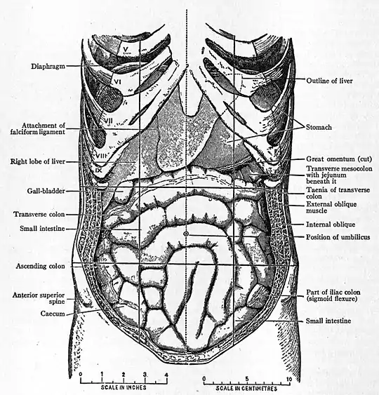 The ribs on the right side are indicated by Roman numerals; it will be observed that the eighth costal cartilage articulated with the sternum on both sides. The subcostal, intertubercular, and right and left Poupart lines are drawn in black, and the mesial plane is indicated by a dotted line. The intercostal muscles and part of the diaphragm have been removed, to show the liver and stomach extending up beneath the ribs. The stomach is moderately distended, and the intestines are particularly regular in their arrangement. |