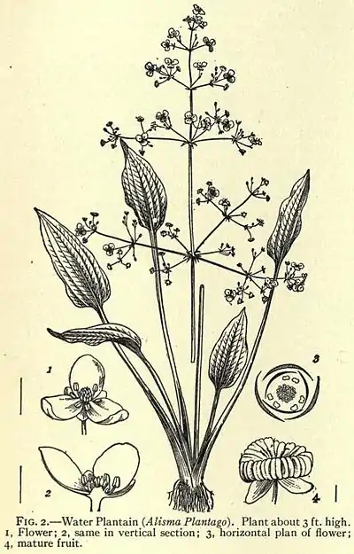 The flowers contain honey, and attract flies, short-lipped bees or other small insects by the agency of which pollination is effected. The fruit of Butomus is of interest in having the seeds borne over the inner face of the wall of the leathery pod (follicle). Damasonium derives its popular name, star-fruit, from the fruits spreading when ripe in the form of a star. It is a western Mediterranean plant which spreads to the south of England, where it is sometimes found in gravelly ditches and pools. The order contains about fifty species in fourteen genera, and is widely distributed in temperate and warm zones. Alisma Plantago (fig. 2), a common plant in Britain (except in the north) in ditches and edges of streams, is widely distributed in the north temperate zone, and is found in the Himalayas, on the mountains of tropical Africa and in Australia.