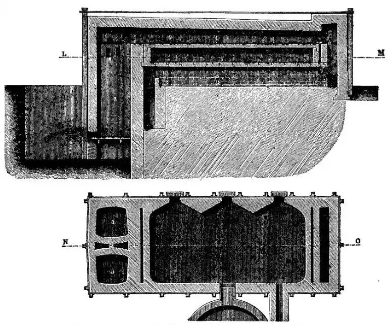 Since the work with ordinary hand-wrought salt-cake furnaces is disagreeable and costly, many attempts have been made to construct mechanical salt-cake furnaces. Of these J. Mactear’s furnaces (fig. 3) have met with the greatest success. They consist of a horizontal pan, 17 ft. wide, which is made up of a central pan (e), and a series of concentric compartments (c1), (c2), (c3), and which is supported on a frame (d d), revolving round a perpendicular axis on the wheels (n n). It is with an arch and heated on the top from one side (l), either by an ordinary coal-grate or by a gas-producer. A set of stirring blades carried in the frame (b b), and driven by gearing, passes through a gap in the arch in such a manner that the gases cannot escape outwards. The salt is conveyed to the furnace by a chain of buckets running on the pulley (g), and passing into the hopper (h), and through the pipe (i) is mixed with the proper amount of acid supplied by the pipe (f). The mixture is fed in continuously to the central pan (e), whence it overflows into the compartments (c1), (c2), (c3) successively until it reaches the circumference, where it is discharged continuously by o and p into the collecting-box (q), being now converted into salt-cake. This furnace acts very well, and has been widely introduced both in Great Britain and in other countries, but it has one great drawback, apart from its high cost, viz. that all the hydrochloric acid gas gets mixed with fire-gases, and consequently is condensed in a weaker and less pure form than from ordinary pots and muffles. This has led some factories which had introduced such furnaces to revert to hand-wrought muffle-furnaces.