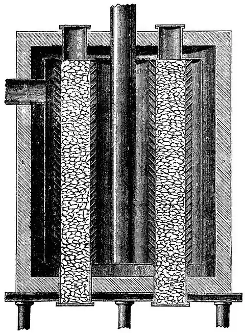 | Fig. 5.—Deacon “Decomposer.” (Sectional Elevation.) a, a, Upright cast-iron cylinders; b, b, brick jacket; c, c, flues; d, e, iron plates arranged like venetian blinds, between which the contact-substance is contained; f, charging hole; g, discharging hole; h, entrance pipe for gas; i, exit pipe for gas. |