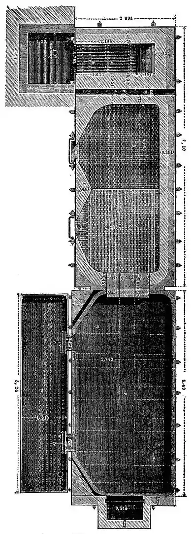The weak chlorine from the Deacon process cannot be treated in this manner, as chambers of impossibly large dimensions would be required. Originally the absorption of the Deacon chlorine took place in a set of chambers, constructed of large slabs of stone, containing a great many horizontal shelves superposed over one another. About sixteen such chambers were combined in such manner that the fresh gas passed into that chamber which had been the longest time at work and in which the bleaching-powder was nearly finished, and so forth until the gas, now all but entirely exhausted, reached the last-filled chamber in which it met with fresh lime and there gave up the last of the chlorine. These “Deacon chambers” occupied a large space, besides being expensive to build and difficult to keep in repair.